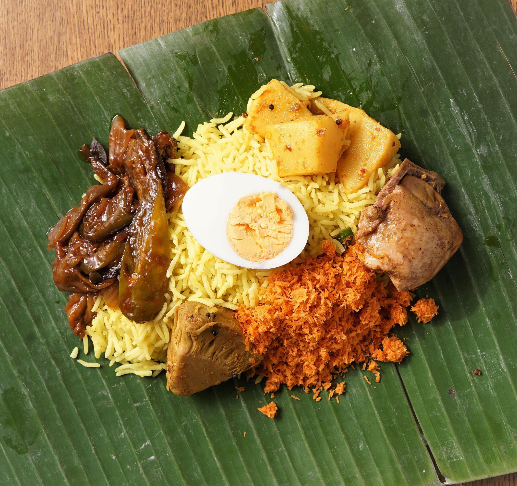 バナナの葉っぱで包んだスリランカのご馳走お弁当。全部を混ぜると五味と香りが一体となり、本場スリランカの味の虜になる事でしょう。